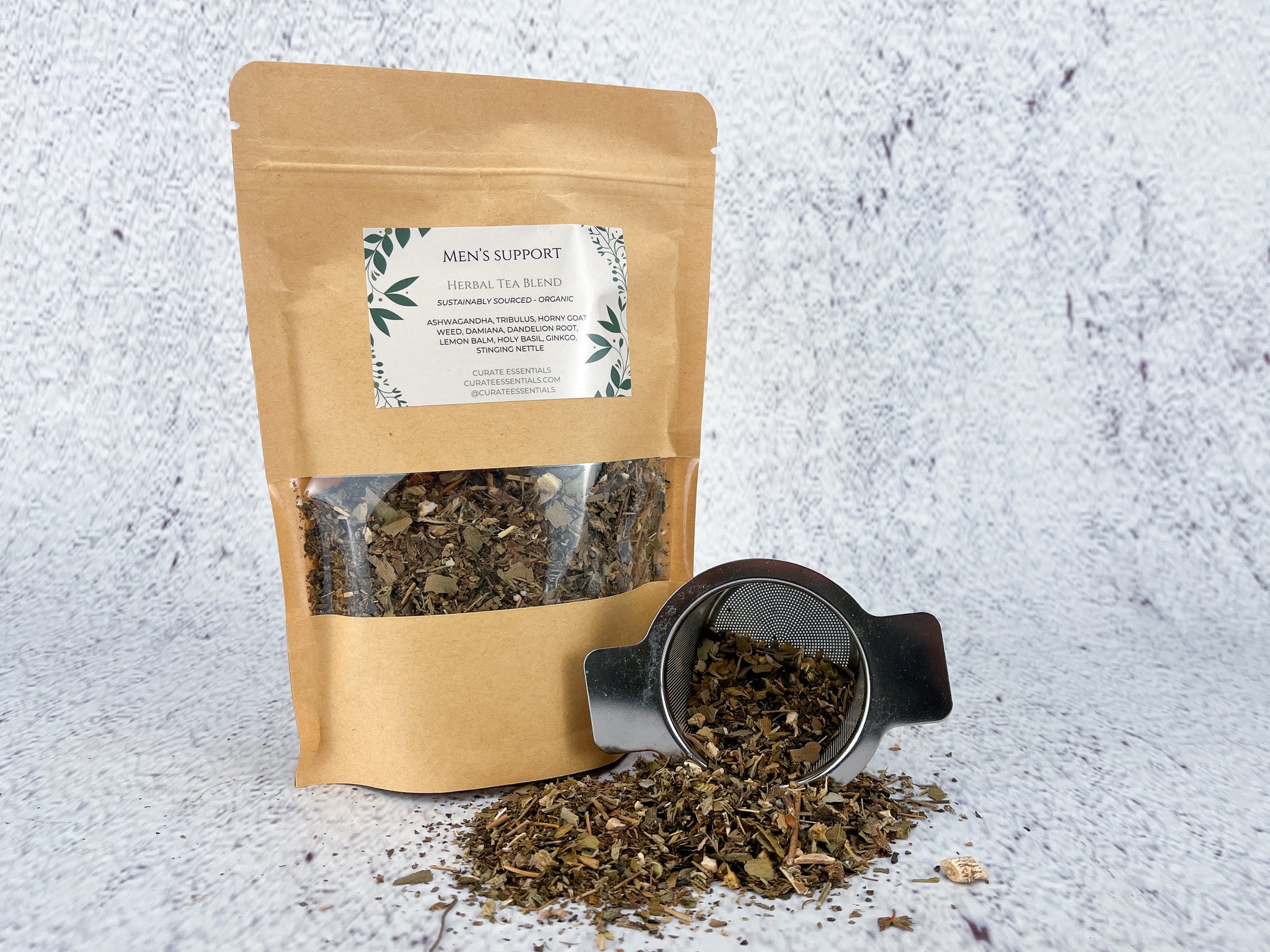 Our Men's Support Tea contains a powerful and nourishing blend of herbs to support men with the demands of modern life. This multi-herb tea combines the benefits of ashwagandha, tribulus, horny goat weed, lemon balm, holy basil (tulsi), damiana, ginkgo and nettle root to relieve stress, increase energy levels, promote circulation and support optimal levels of male reproductive hormones and libido. Dandelion root to support blood sugar management and boost skin, liver, and heart health.